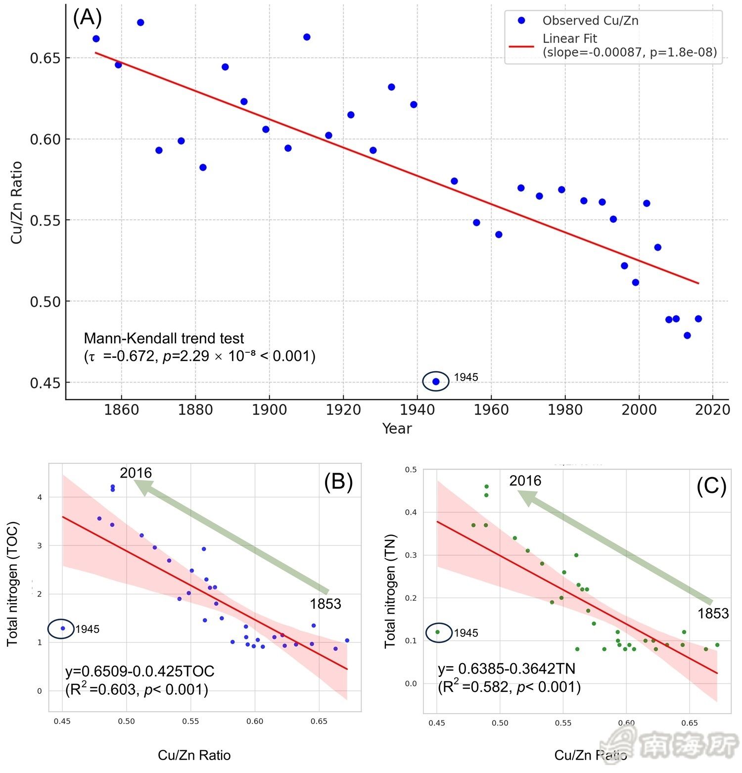 图2. 散点图显示显著负相关关系:(a) cu/zn与年份之间的负相关关系;(b) cu/zn与总有机碳(toc)之间的负相关关系;(c) cu/zn与总氮(tn)之间的负相关关系。这些关系通过线性回归和时间序列分析得出,突出了氧化还原动态对沉积物中toc和tn保存的影响。