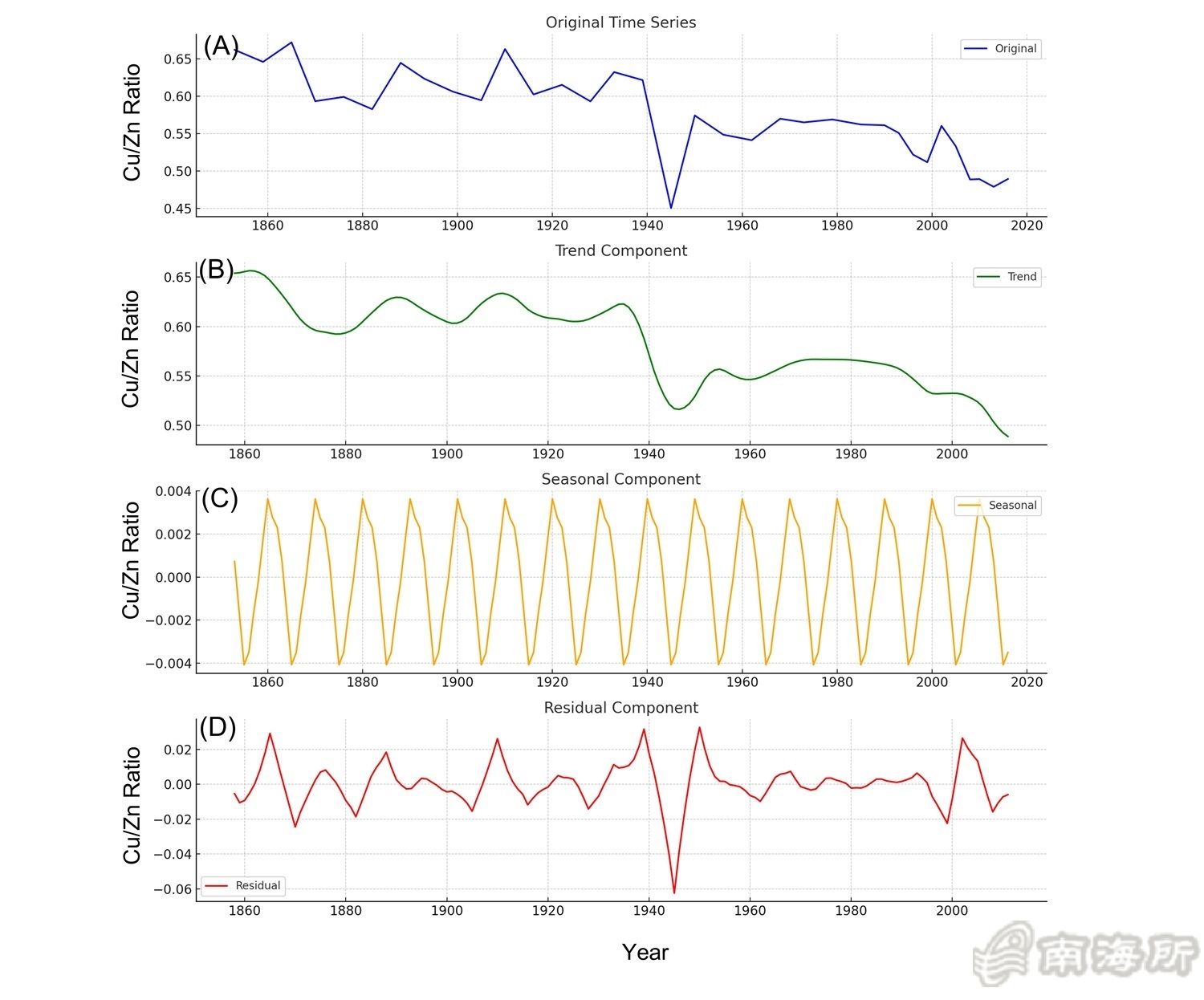 图1. 新村湾柱状沉积物样本中cu/zn比率在过去167年(1853~2016年)的长期变化趋势(a) cu/zn比率的原始时间序列数据,显示出一个逐渐下降的趋势,反映了新村湾水体中氧化还原电位的下降;(b) 通过时间序列分析得出的新村湾柱状沉积物样本中cu/zn比率的长期趋势,显示出cu/zn比率的逐渐下降,表明该水体氧化还原电位的持续下降;(c) 通过时间序列分解提取的季节性成分,表明季节性变化极小,与长期沉积过程一致;(d) 在去除长期趋势和季节性成分后的残差,显示随机波动,表明数据中没有其他系统性模式。