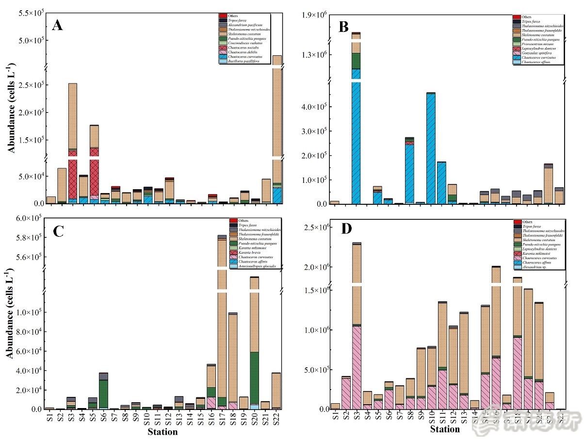 图1 2023年江门牡蛎养殖海域有害微藻的时空变化